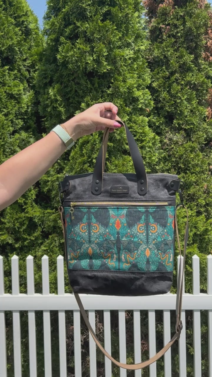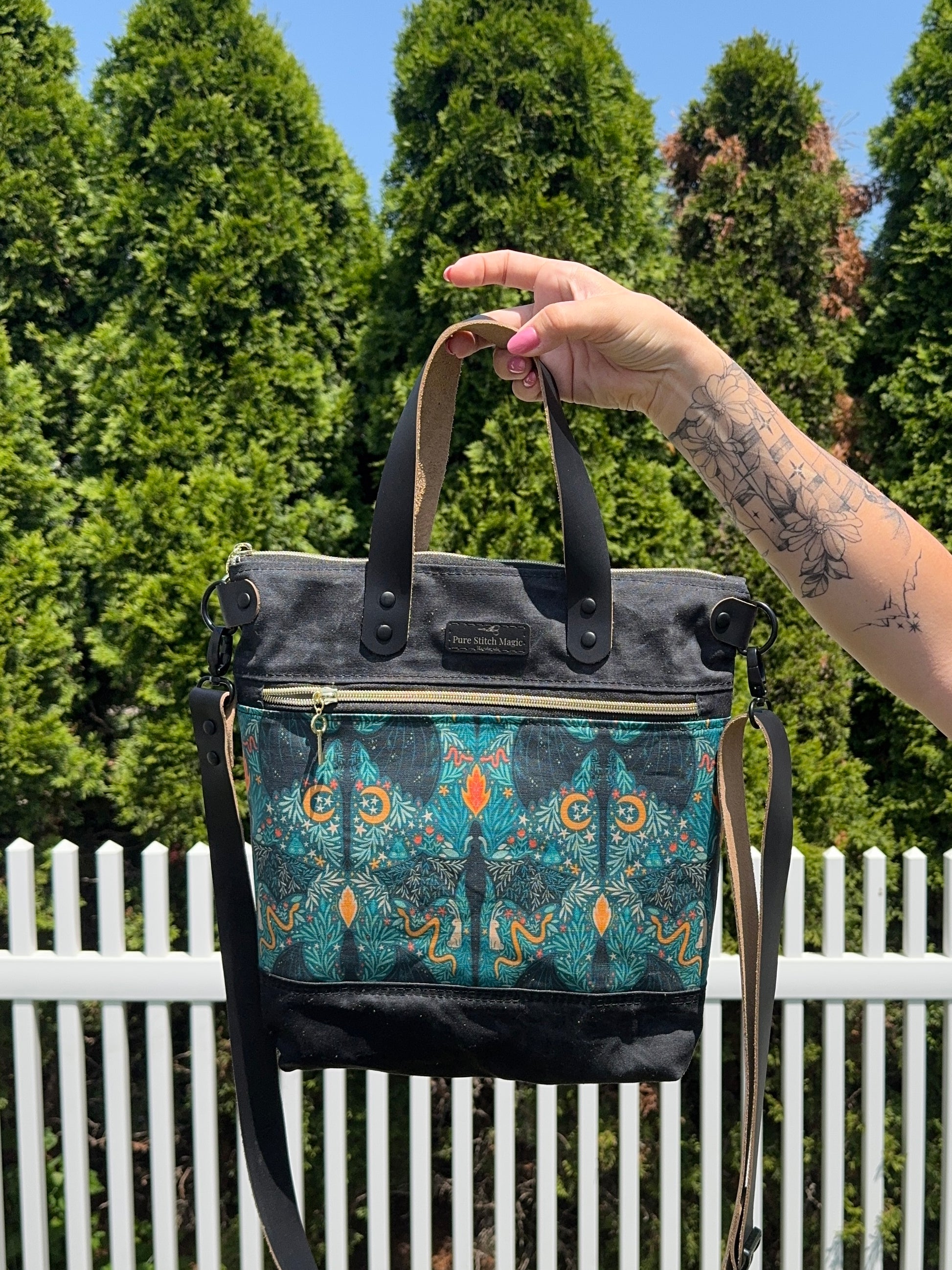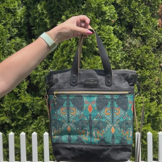 Bold, moody, and beautifully detailed — this version of the Aberdeen Tote features a rich Art Nouveau-style dragon print layered over durable black waxed canvas and finished with luxe leather accents.