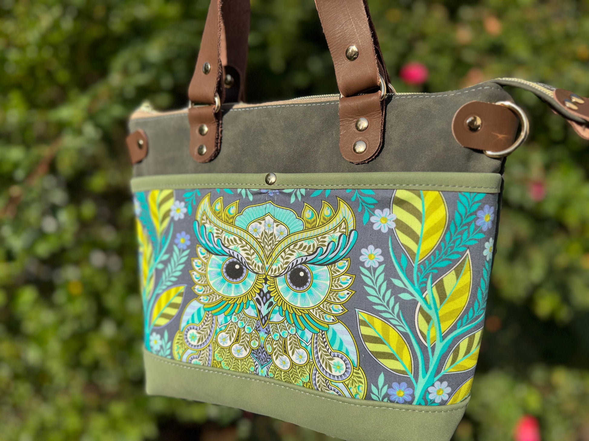 Make a bold statement with this handcrafted Cami Bag, featuring the iconic owl print from beloved fabric designer Tula Pink. The colorful, detailed owl design takes center stage against a luxe faux suede exterior, paired with genuine leather accents for a timeless, high-quality finish.