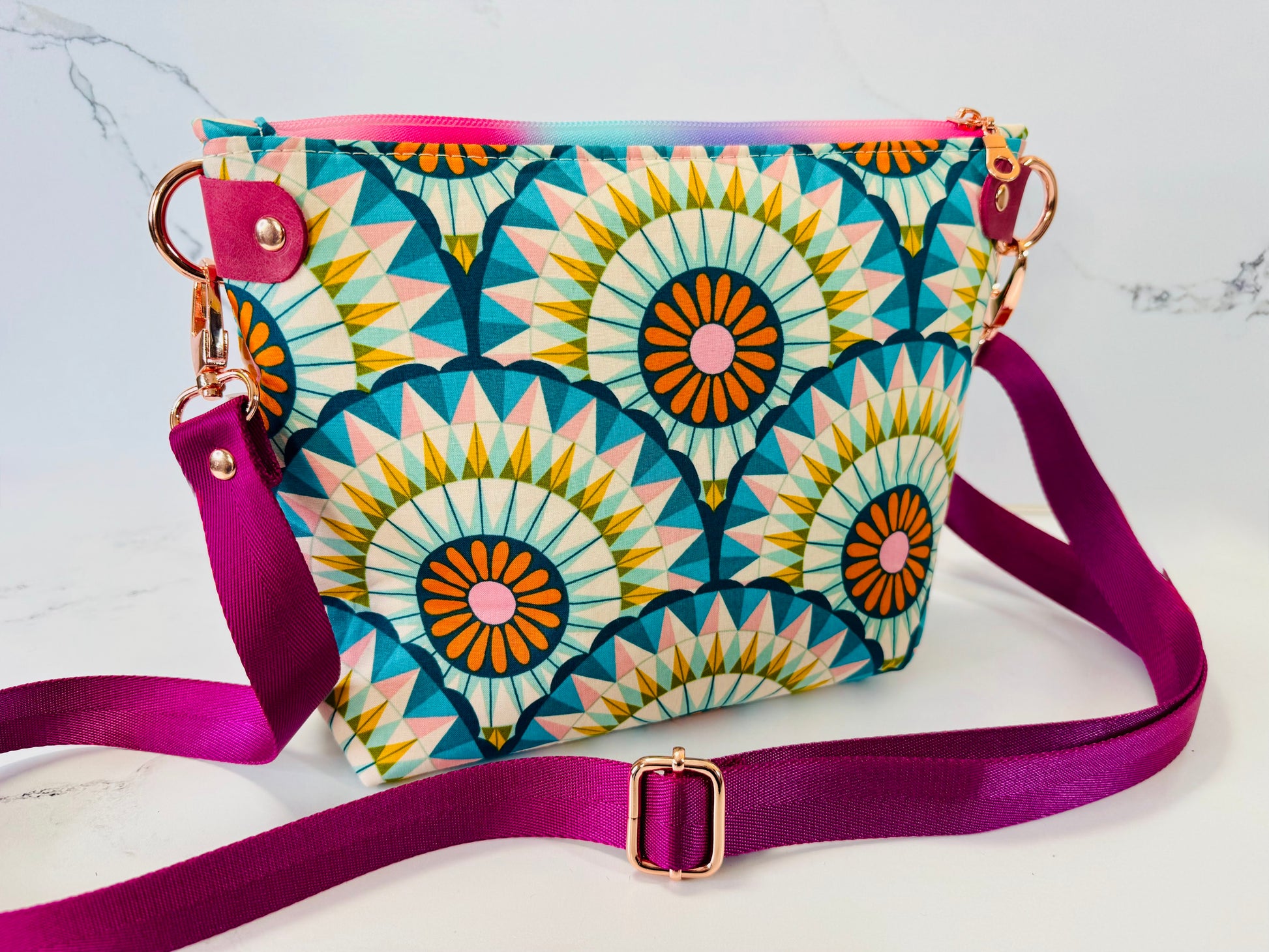 The Willow Crossbody – The Enchanted Meadow features a whimsical meadow scene with florals, butterflies, and carousel-inspired details in vibrant greens, teals, and pinks. The bold cotton exterior is paired with rich purple webbing and rose gold hardware, giving this piece a playful yet elevated finish.