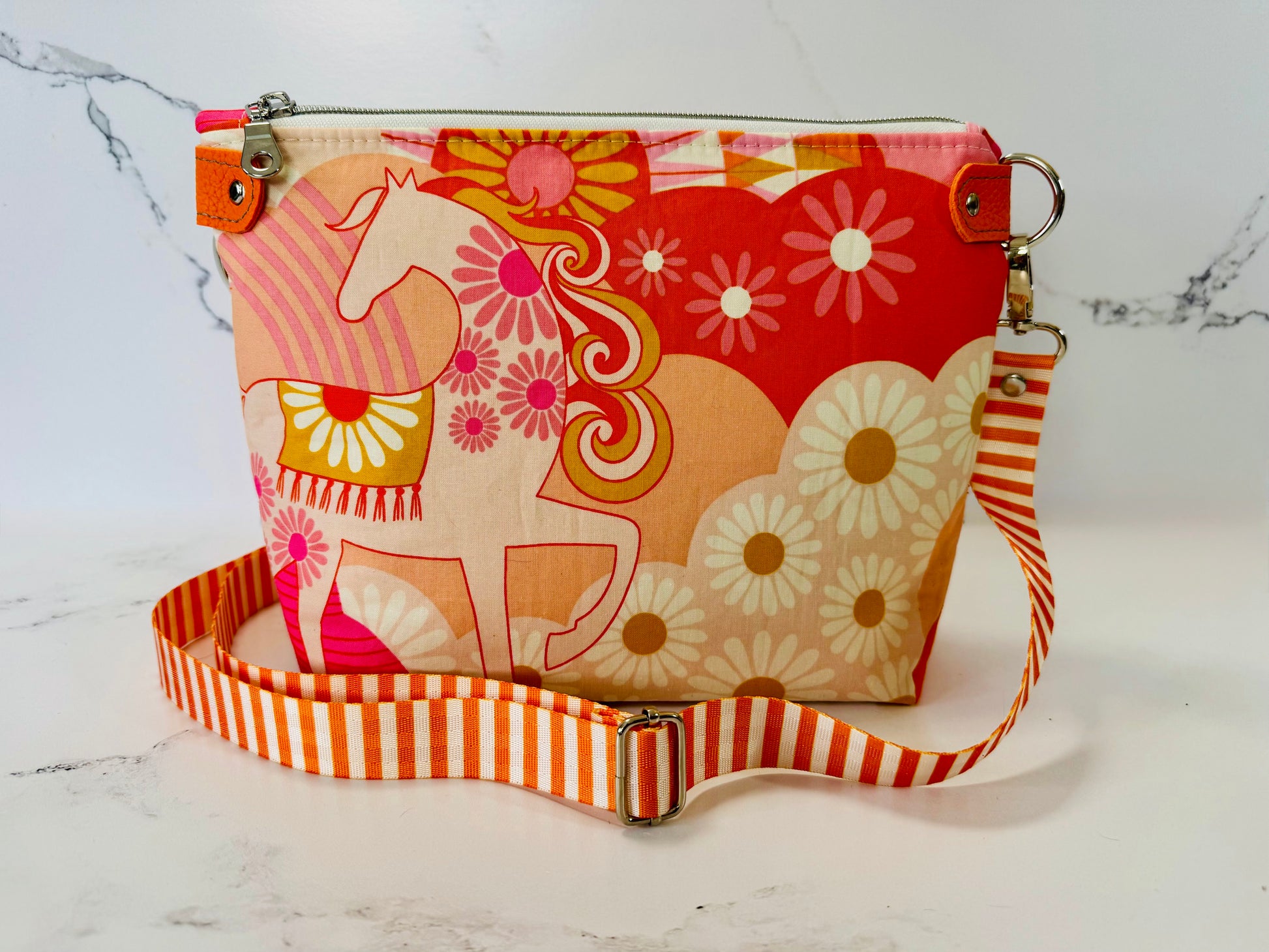 The Willow Crossbody – Carousel Daydream features a whimsical carousel horse design in warm shades of peach, pink, and orange. The vibrant exterior cotton fabric is paired with orange accents and silver hardware for a playful yet polished finish.